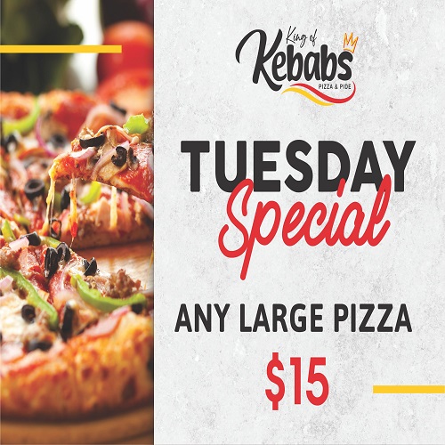Tuesday Deal $15$15Any Large PizzaAvailable day: Tuesday- Wednesday Special $19$191 LRG Pizza and 1.25L DrinkAvailable day: Wednesday